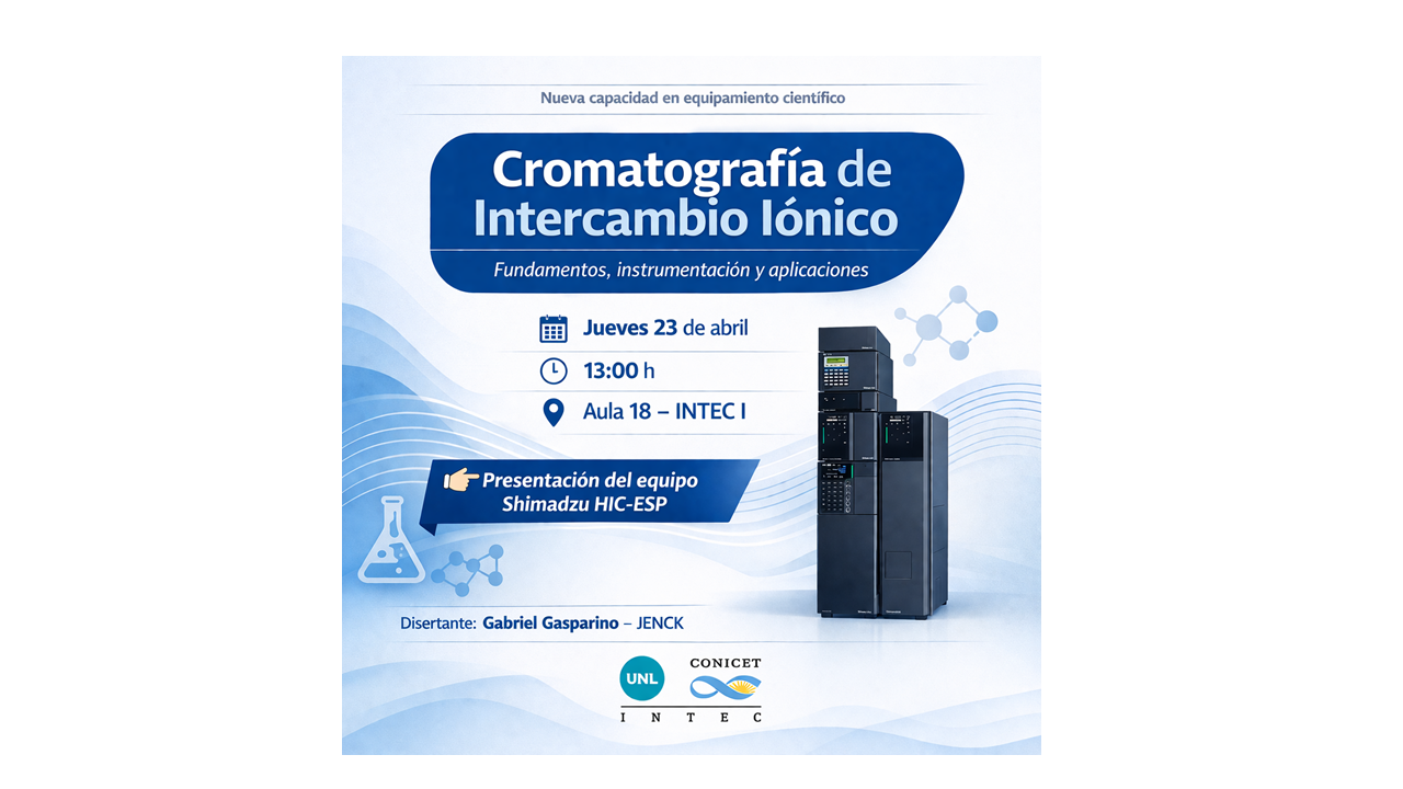Con motivo de la puesta en marcha del equipo de cromatografía iónica adquirido en el marco de la Convocatoria Plan de Excelencia en Investigación Científica – Equipamiento SF PEICE 2023 de la Secretaría de Ciencia, Tecnología e Innovación de la Provincia de Santa Fe, tenemos el agrado de invitarlos a participar de la charla de presentación a cargo de personal de la empresa JENCK.